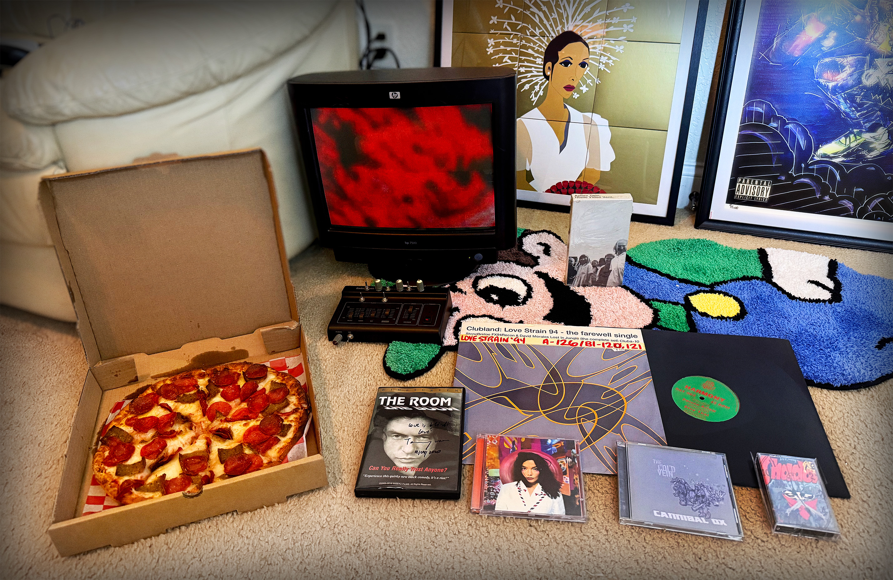 A Compaq 7500 monitor with a new video mixer, courtesy of @DecayingElectronics. We also got a copy of The Room signed by Tommy Wiseau, an Aphex Twin - Come to Viddy VHS, DJ Harmony's "Stop That / Poison Arrow," Clubland - Love Strain 94, Björk - Post, Cannibal Ox - The Cold Vein, Mach-Hommy - 5 O'Clock Shadow, and a fuuuckin pepperoni and lamb pizzaaaa.