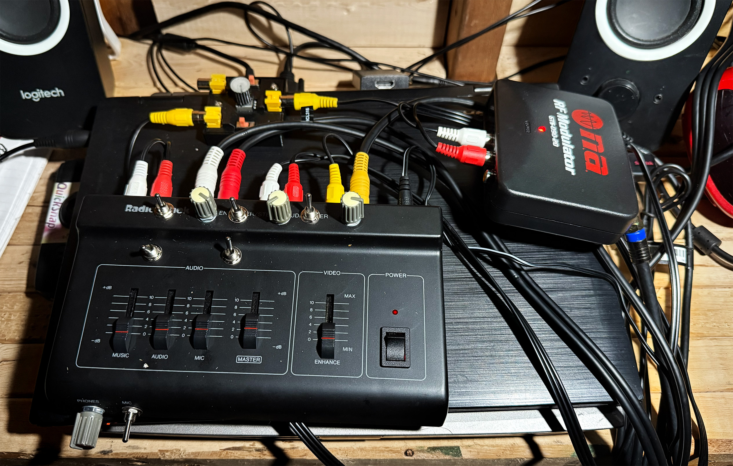 My experience with this mixer so far has been marked by the versatility that comes with having extra knobs to twiddle. I had spent the night playing some of the Aphex Twin tape along with copies of various YouTube videos and it went about as well as you would expect. Every second spent with this thing only made me feel closer to my dreams of becoming a "video DJ" of some sort. The main limitation is having only a single video input which makes it function more like a filter than a full on mixer, but that's alright. The best solution has been to actually daisy-chain it with the other units at bay. Whole thing is a mess but never have I been more thankful to have random cables lying around.